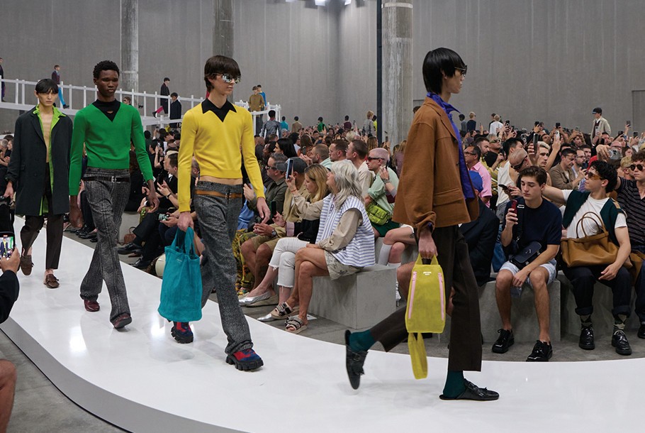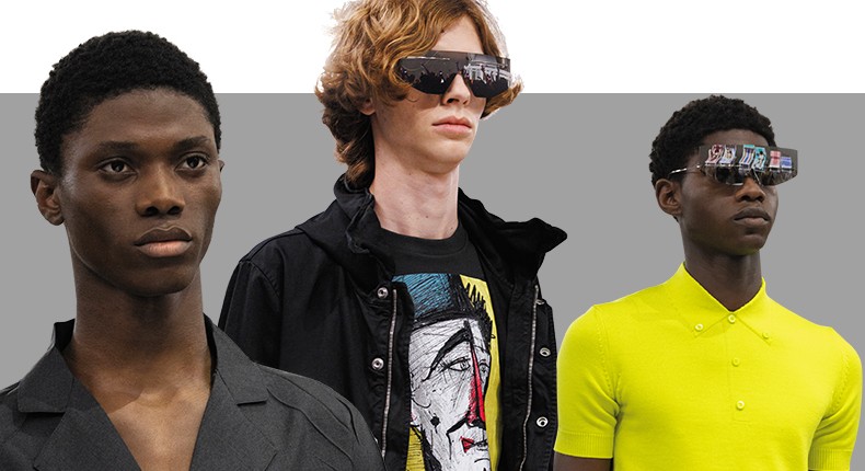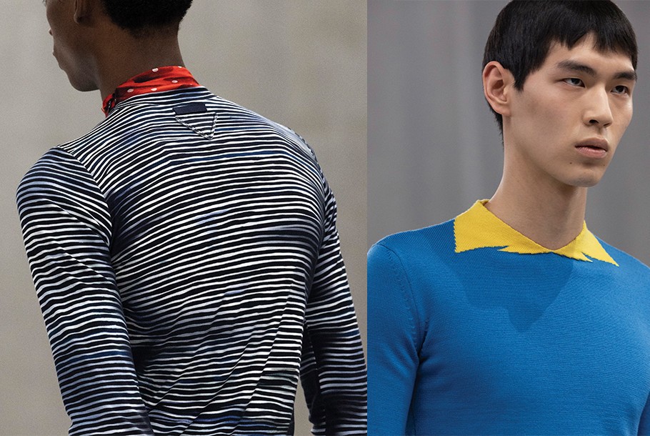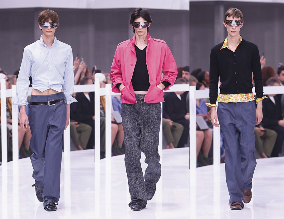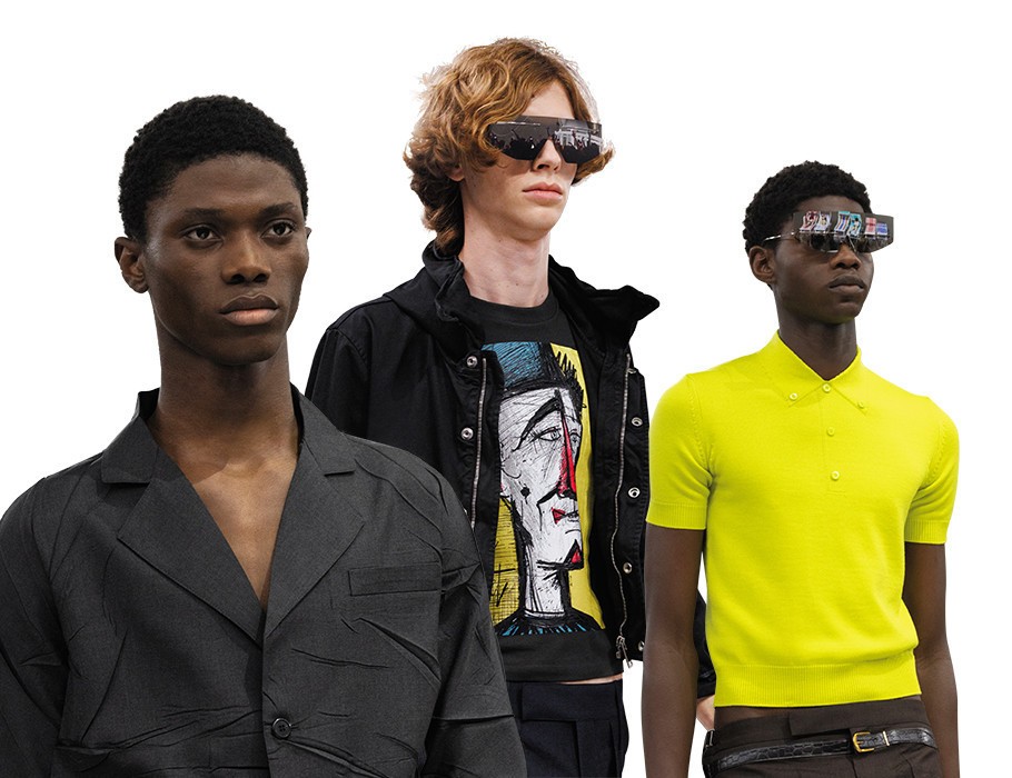 이번 컬렉션은 멀리서 보았을 때와 실체가 분명하게 달랐다. 니트와 레이어링한 셔츠는 하나의 옷으로 연결되어 있었다. 대부분 옷의 칼라, 소매, 밑단은 와이어 장치로 역동적인 움직임을 부여해 생동감 있게 연출했다. 팬츠엔 벨트를 프린트로 부착했고, 미러 렌즈 실드 선글라스엔 눈앞 풍경이 비친 듯 해변의 실사를 선명하게 새겨 넣었다. 빈티지한 줄무늬 티셔츠와 목에 두른 반다나도 모두 인쇄된 것이었다. 헤링본 트위드 소재 팬츠도 실제가 아닌 프린트. 빛바랜 워싱, 잘못된 주름 등 옷에 새긴 시간의 흔적도 모두 인위적으로 만든 것들. 의도적으로 길거나 짧게 연출한, 과장된 비율의 디자인들을 직관적으로 조합했다. 실재하지 않는 것과 완벽하지 않은 것들의 매끄러운 조화는 새로운 현실로 인식되었다. 그러다 예상치 못한 순간에 베르나르 뷔페(Bernard Buffet)의 그림을 콘서트 티셔츠처럼 새긴 룩이 튀어나오기도 한다. 이건 아마도 프라다가 추구하는 자유와 정신, 낙관주의와 젊은 에너지가 발휘되는 순간.