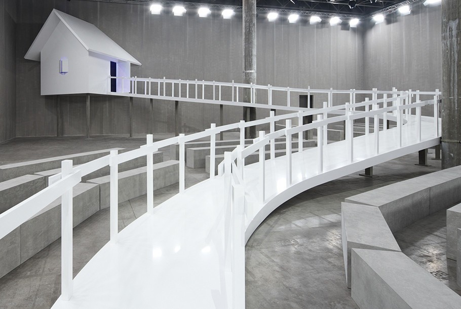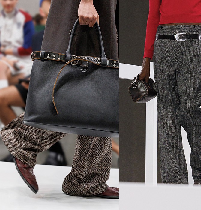 쇼를 앞두고, 유난히 어둡고 침침했던 쇼장에 불이 환하게 켜지며 새하얀 길이 등장했다. 길 따라 높은 언덕 위의 작은 오두막을 통해 모델들이 내려왔다. 가늘고 긴 몸을 강조하는 슬림한 실루엣, 얼굴을 반쯤 덮는 실드 선글라스를 쓴 그들은 마치 다른 차원의 문을 지나온 사람처럼 친밀한 듯 생경한 오라. 미우치아 프라다와 라프 시몬스는 “우리는 지금 입고 싶은 것들에 대한 컬렉션을 만들고자 했습니다. 이번 컬렉션은 직관적이며, 신중하지만 예상치 못한 방식으로 조합한, 한순간 머릿속을 스쳐가는 생각에 관한 것”이라고 했다. 그 말의 의미는 모델들이 눈앞에 다가왔을 때 비로소 이해하게 된다.