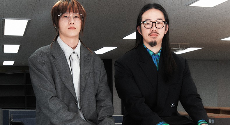 제이 플로우가 입은 셔츠·재킷 모두 레이블리스, 아이웨어 보테가 베네타, 팬츠·슈즈·양말 모두 스타일리스트 소장품. 짱유가 입은 팬츠 뉴인, 재킷 마르니, 아이웨어 젠틀몬스터, 이어링·네크리스 모두 최창남 메이드, 링·타이 모두 스타일리스트 소장품.