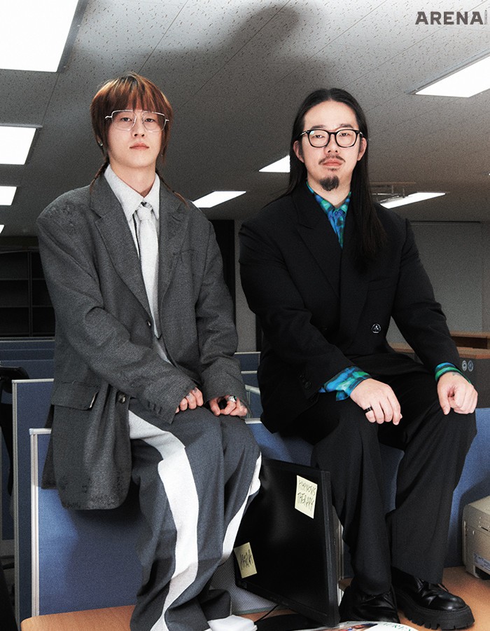 짱유가 입은 셔츠·타이·팬츠·슈즈 모두 뉴인, 재킷 마르니, 아이웨어 젠틀몬스터, 이어링 최창남 메이드, 링 스타일리스트 소장품. 제이 플로우가 입은 셔츠·재킷·팬츠 모두 레이블리스, 아이웨어 셀린느, 슈즈·링 모두 스타일리스트 소장품.