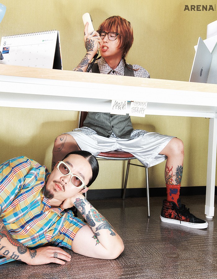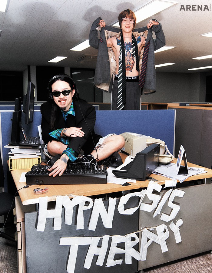 세월의 흔적이 그대로 드러나는 전형적인 사무실 풍경과 온몸에 그림을 잔뜩 새긴 그들의 대비는 보기만 해도 웃음이 나왔다. 여지껏 사무실에는 발도 들여놓지 않았을 듯한 두 사람은 금세 공간을 자신들의 색으로 장악했다. 힙노시스 테라피는 짱유와 제이 플로우로 이루어진 전자음악 듀오다. 그들의 음악은 플레이 버튼을 누르는 순간 폭발적인 에너지와 다층적인 사운드 레이어, 빠르게 질주하는 리듬을 내리꽂아 육체와 정신을 매료시킨다. 본능의 영역에 가까운 사운드는 순식간에 일상을 깨고 다른 차원으로 탈주를 돕는다. 절절한 감성에 호소하는 가요와 달리 ‘청각을 통한 시각적 체험’을 제시하는 이들의 일렉트로닉은 답답한 일상에 지친 현대인에게 지금 가장 필요한 탈출구일지 모른다.