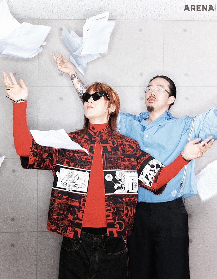 짱유가 입은 레드 니트 톱 지민리, 아이웨어 발렌시아가, 이어링·브레이슬릿·링 모두 최창남 메이드, 패턴 재킷·팬츠 모두 스타일리스트 소장품. 제이 플로우가 입은 팬츠 코스, 아이웨어 젠틀몬스터, 셔츠 스타일리스트 소장품.