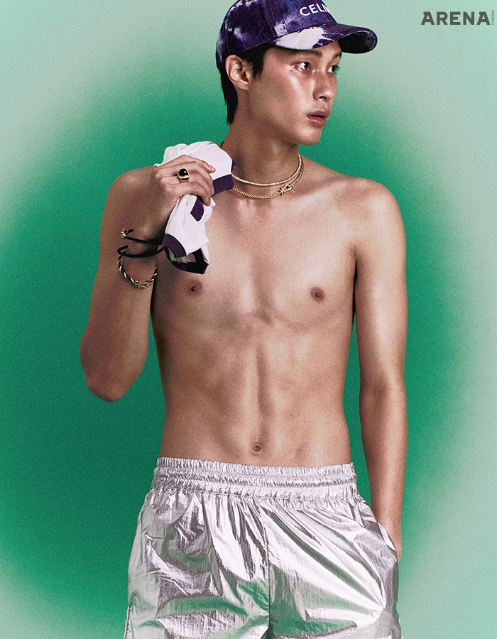 약지에 착용한 거친 질감이 돋보이는 화이트 골드 소재의 마크리 포 맨 이터넬레 링 400만원대·옐로 골드와 화이트 골드가 조화로운 페디 이터넬레 링 200만원대 모두 부첼라티, 로즈 골드 소재에 다이아몬드를 세팅한 쉔 당크르 디바인 이어커프 가격미정 에르메스 제품. 크롭트 티셔츠 5만9000원 프롬아를, 하이브리드 데님 팬츠 가격미정 발렌시아가, 스누피 프린트 스윔 쇼츠 에디터 소장품.