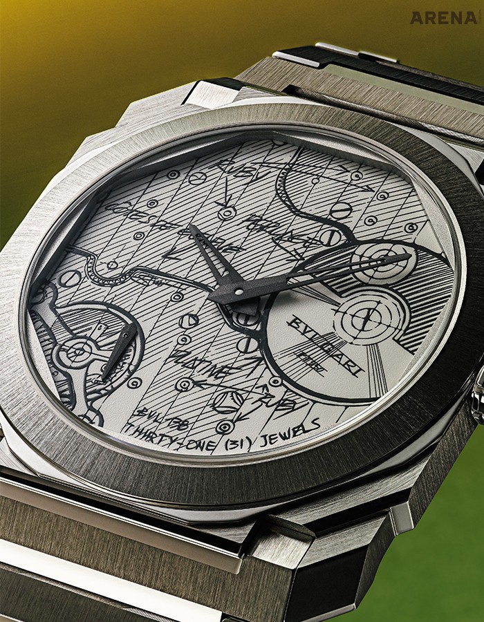 2014년 처음 출시된 이후 현대 워치메이킹 분야에서 독보적인 위치로 활약하는 불가리 옥토 피니씨모 워치가 무브먼트를 감상하는 참신한 방식을 구현했다. 크리에이티브 디렉터 파브리지오 부오나마사 스틸리아니가 손으로 그린 무브먼트 스케치를 다이얼 위에 그대로 올린 것. 두께 2.23mm에 불과한 시계를 구동하는 BVL138 칼리버와 36개의 주얼 개수까지 이토록 직관적이고 세밀하게 소개하는 다이얼은 손끝으로 만들어내는 시간의 아름다움을 예찬한다. 별도의 인덱스 없이 매트한 블랙 핸즈로 시간과 스몰 세컨즈를 표시해 더없이 우아한 이 시계는 280피스 한정 발매된다.