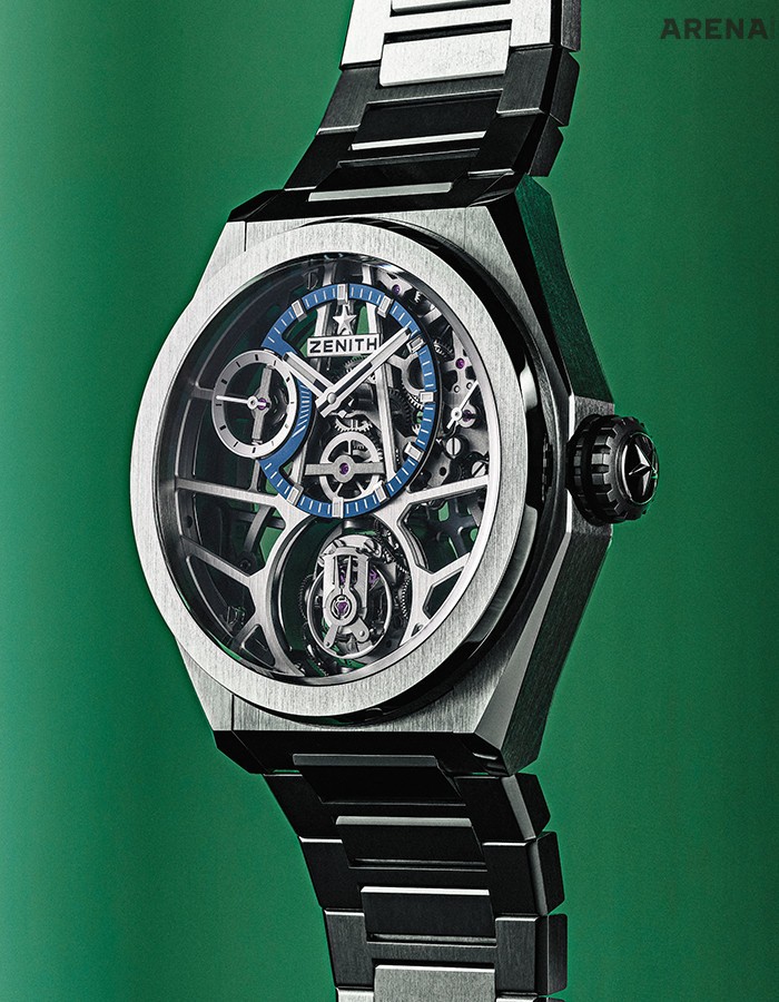티타늄으로 제작된 케이스와 브레이슬릿 속 골조만 남긴 오픈워크 다이얼이 압도적이다. 하지만 이 시계의 핵심은 6시 방향에 위치한 소형 자체 조정 중력 제어 장치에 있다. 잠수용 크로노그래프 워치의 자이로스코프에서 영감받은 모듈은 조정 장치와 밸런스 휠을 언제나 수평으로 유지한다. 139개의 부품을 고작 콩알만 한 크기, 깃털처럼 가벼운 무게로 구현한 기술력은 경이에 가깝다. 탁월한 정확성을 이중으로 보장하기 위해 수동 와인딩 방식의 엘 프리메로 8812S 칼리버를 채택했다. 시간당 진동수 36,000vph(5Hz) 박동하는 무브먼트로 10분의 1초까지 측정이 가능하다.