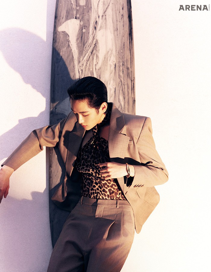 싱글 버튼 재킷·레오퍼드 패턴의 홀터넥 톱·팬츠·오픈 커프 브레이슬릿 모두 가격미정 생 로랑 by 안토니 바카렐로 제품.