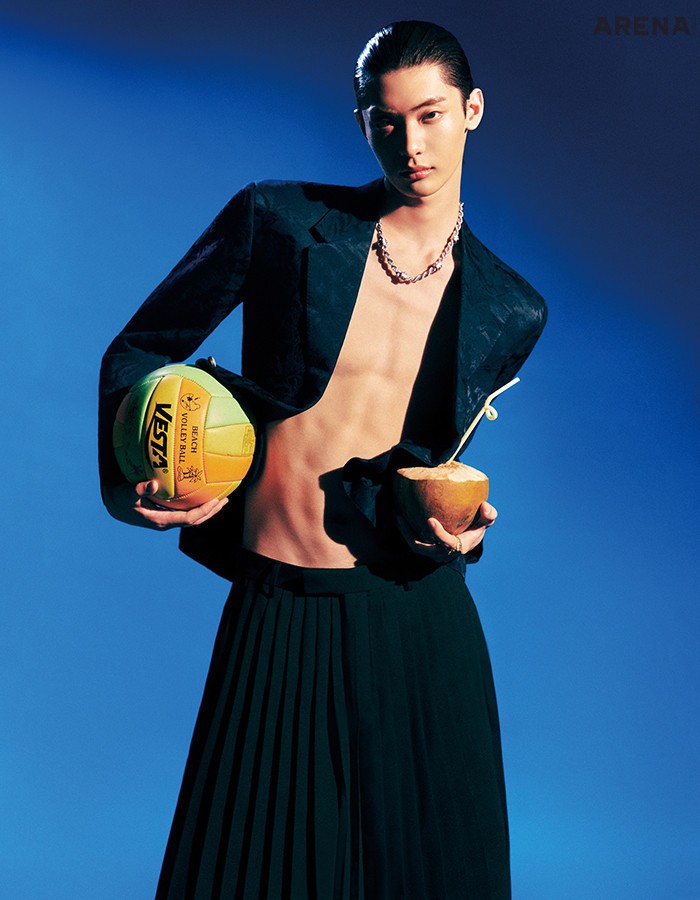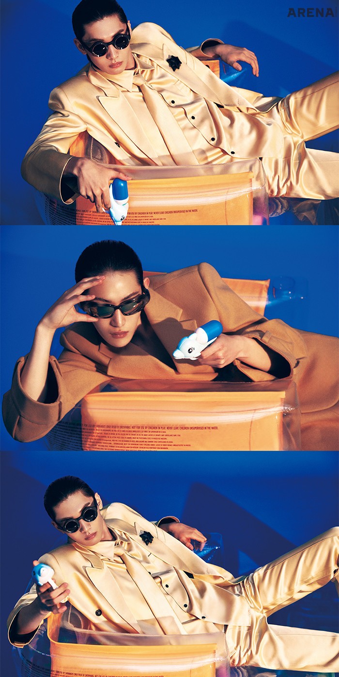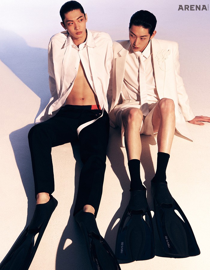 (왼쪽부터) 타이 디테일 셔츠·팬츠 모두 가격미정 구찌, 스윔 쇼츠 가격미정 스피도, 오리발 에디터 소장품. 플라워 모티브 장식 재킷 510만원·셔츠 140만원·쇼츠 가격미정 모두 발렌티노, 타이 가격미정 발렌티노 가라바니, 오리발 에디터 소장품.