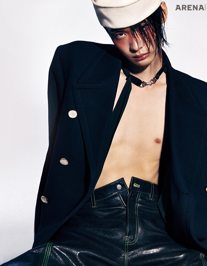 피코트·세일러해트 모두 가격미정 루이 비통, 레더 팬츠 가격미정 아크네 스튜디오, 메탈 디테일의 실크 타이 가격미정 구찌 제품.