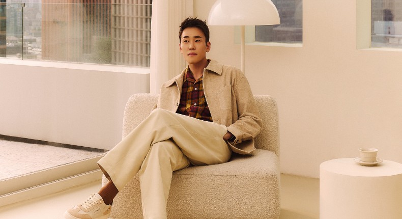 베이지 코듀로이 재킷 89만9000원·코튼 체크 셔츠 59만원·헤비 코튼 소재의 벌룬 팬츠 52만9000원 모두드 본팩쳐 by 브로이어, 베이지 스니커즈 35만9000원 에스.티. 듀퐁 슈즈 제품.