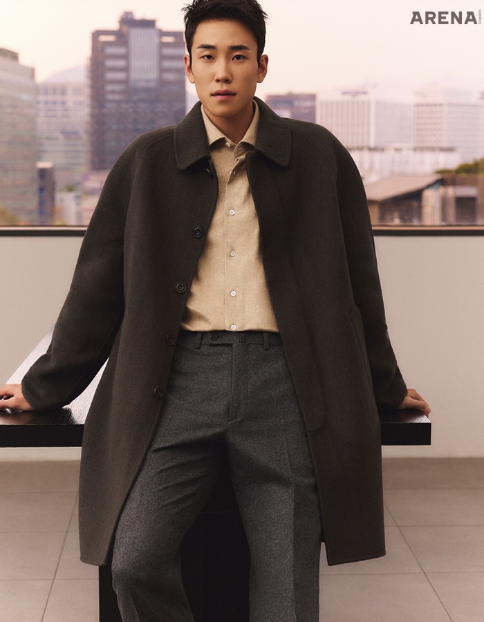 카키 브라운 울 혼방 코트 149만원 하트포드 by 브로이어, 베이지 코튼 셔츠 53만9000원 브로이어, 그레이 모직 팬츠 89만원 버나드 장 by 브로이어 제품.