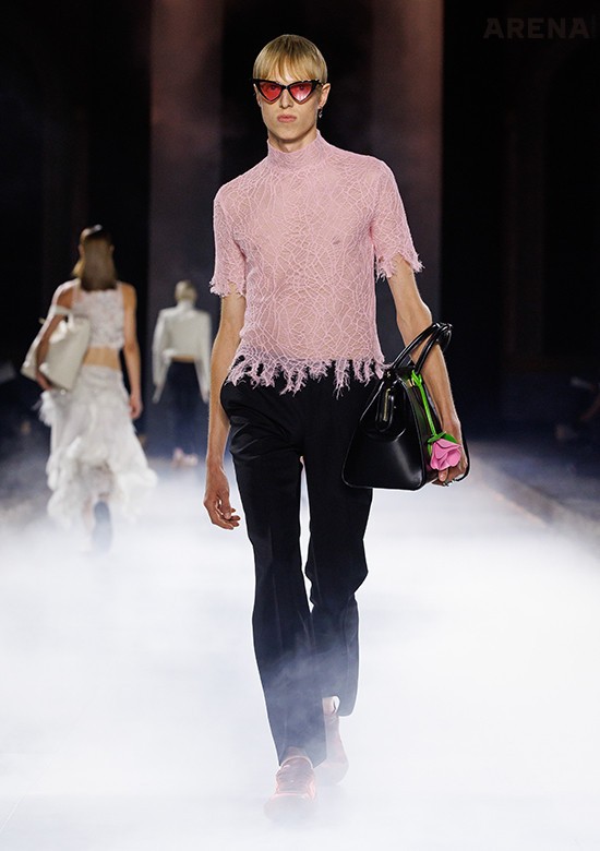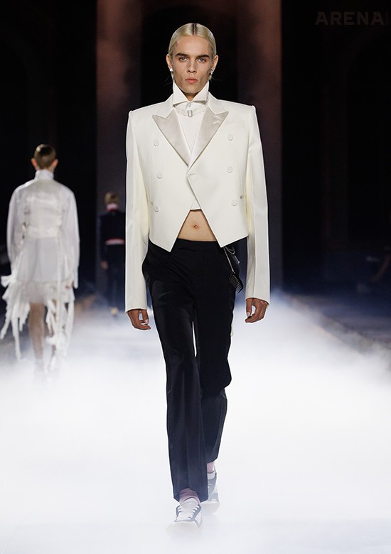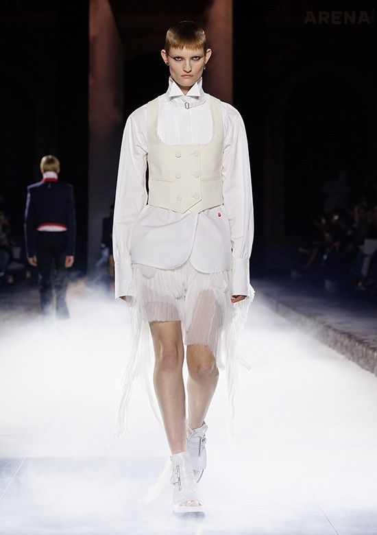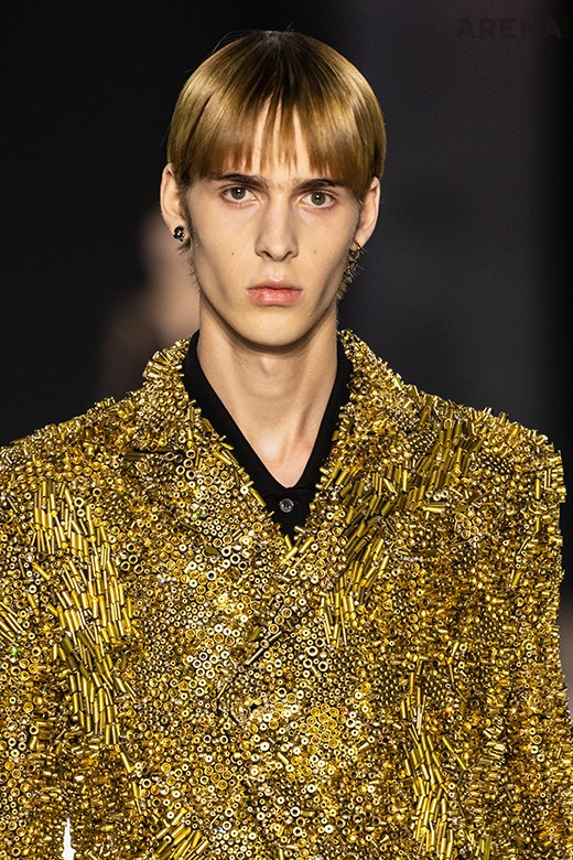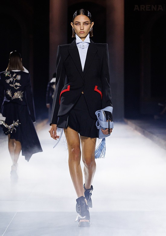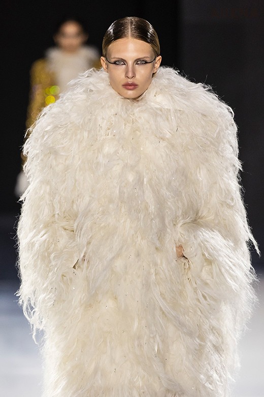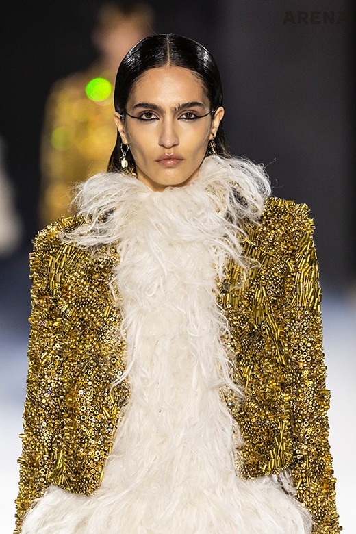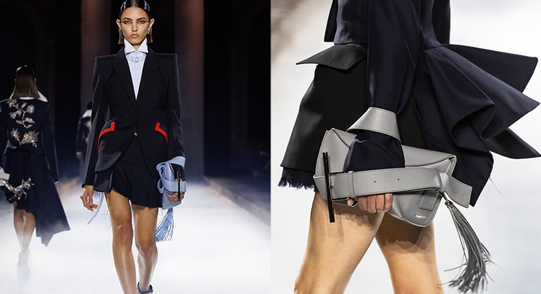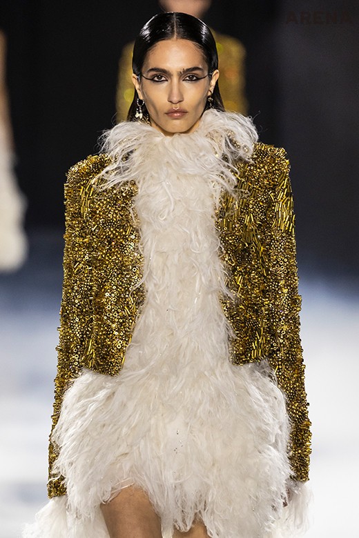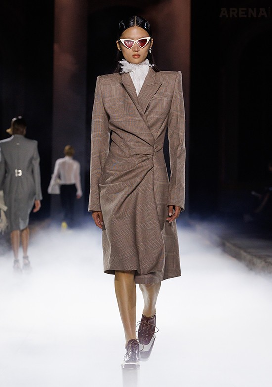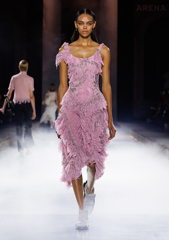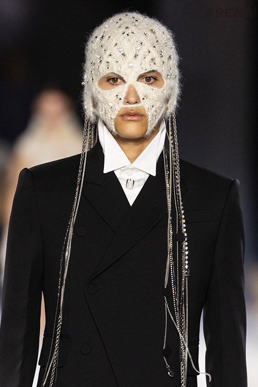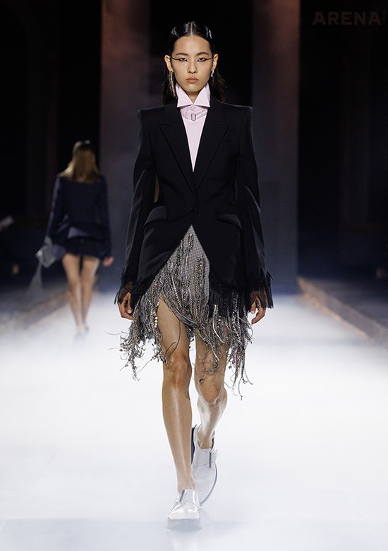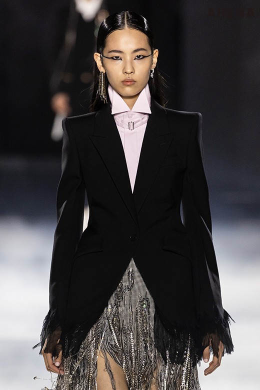 맥퀸의 크리에이티브 디렉터 션 맥기르(Seán McGirr)는 다분히 영국적인 헤리티지를 날카로운 시선으로 재해석했다. 어린 시절 구전으로 전해온 밴시 설화는 이번 컬렉션의 영감이 됐다. 전통적인 영국식 수트는 누군가 세게 움켜쥔 것처럼 뒤틀려 있고, 독특한 T-바가 돋보이는 선명한 실루엣을 선사한다. 무엇인가로 들어올린 것처럼 좁고, 높이 솟은 어깨라인은 이번 시즌에도 유효하다. 워싱하고, 잘게 자르고, 다듬은 실크 시폰과 오간자의 활용도 눈에 띄었다. 고운 브러시드 실크를 엮어서 만든 정교한 코브웹 레이스는 실이 풀리는 듯한 착시를 일으켰고, 오간자는 밴시의 빗이 꽂힌 덩굴손 형상으로 길게 늘어졌다. 주얼리 역시 밴시 설화에 나오는 머리 빗, 길게 늘어지는 ‘발견된 물건’ 사슬 등에서 영감 받았다.
