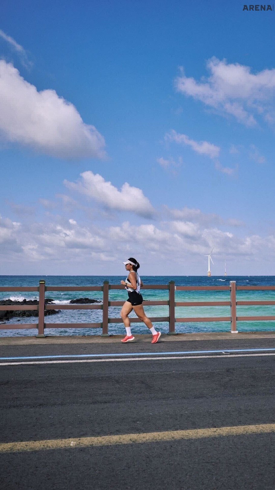 출발 카운트다운이 시작되자 응원과 함성 소리가 바닷바람을 뚫고 코난 해변을 꽉 채웠다. 이번 대회의 또 한 가지 묘미는 베이스캠프에 설치한 대형 스크린에서 실시간으로 팀별 순위가 공개 된 점이었다. 각 포인트를 지나는 팀원의 위치 파악은 물론, 현장 상황은 알 수 없지만 엎치락뒤치락하는 순위를 실시간으로 보고 있자니 얼마나 치열한지 안 봐도 알 수 있었다. 1번 주자가 도착하고 2번 주자가 나섰다. 1번과 같은 코스를 뛰는 3번 주자였기에 코스에 대한 조언을 구하며 다음 순서를 기다렸다. 생각보다 강한 맞바람과 뜨겁다 못해 모든 수분을 증발시킬 것 같은 태양 그리고 야속하리만큼 잔잔하게 이어지는 오르막길이 상당히 힘들다는 평이었다. 2번 주자들이 반환점을 돌고 실시간 순위가 공개될 때마다 경기 결과는 아무도 예측할 수 없었다. 예선전 결과가 절대적인 기준이 될 수 없었기 때문이다. 몸에 열을 내기 시작하고 근육을 풀던 와중 드디어 달릴 차례가 왔다. 흔히 말하는 ‘대회 뽕'에 취해 오버 페이스 하지 않도록 마음을 다잡았지만, 신선한 해풍과 제주도 절경이 담긴 해안 도로를 달리니 살짝 오버 페이스 할 수밖에 없었다. 분명 즐기면서 뛰자고 마음먹었지만, 본능적으로 승부욕이 발동됐다. 아무도 경계하지 않았지만 나 혼자 다른 러너들을 의식하며 이를 악물고 뛰었다. 역시 쉽지 않았다. 바닷바람은 상당히 밀도가 있어 맞바람이 불 때는 앞으로 치고 나가기 힘들었다. 그리고 오후 4시 제주도의 해는 그 어느 때보다 뜨겁게 느껴졌다. 1번 주자가 조언했던 잔잔하게 이어지는 오르막길을 달리니 서울에서 타던 따릉이가 그리워졌다. 이미 완주한 1, 2번 주자가 부럽다는 생각과 함께 우리 팀에 민폐를 끼치지 않겠다는 다짐 그리고 과거에 ‘풀 코스는 어떻게 뛰었을까’ 오만가지 생각을 하며 해안 도로를 달렸다. 풀코스에서 40km를 지나고 남은 2.195km가 가장 고통스럽 듯, 10km 지점을 돌파하고 남은 1.1km가 잔인하게 느껴졌다. 5분의 시간이 마치 50분처럼 흐르고, 길고 긴 생각 끝에 어느덧 골인 지점에 도착했다. 4번 주자에게 어깨끈을 전달하고 나서야 드디어 안심하고 숨을 고를 수 있었다.