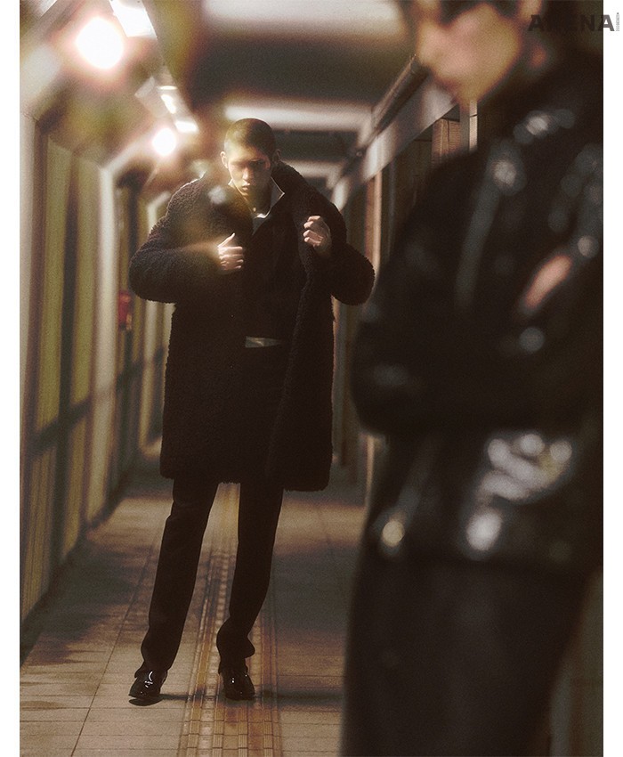 시어링 코트·흰색 셔츠·검은색 베스트·재킷·팬츠·첼시 부츠 모두 가격미정 셀린느 옴므, 레더 블루종·검은색 팬츠 모두 가격미정 톰 포드 제품.