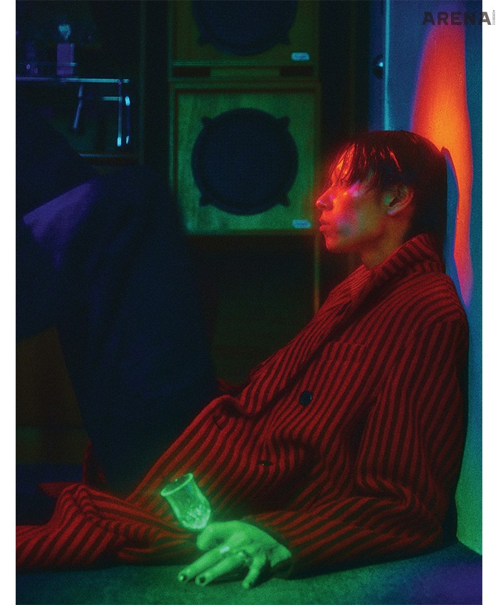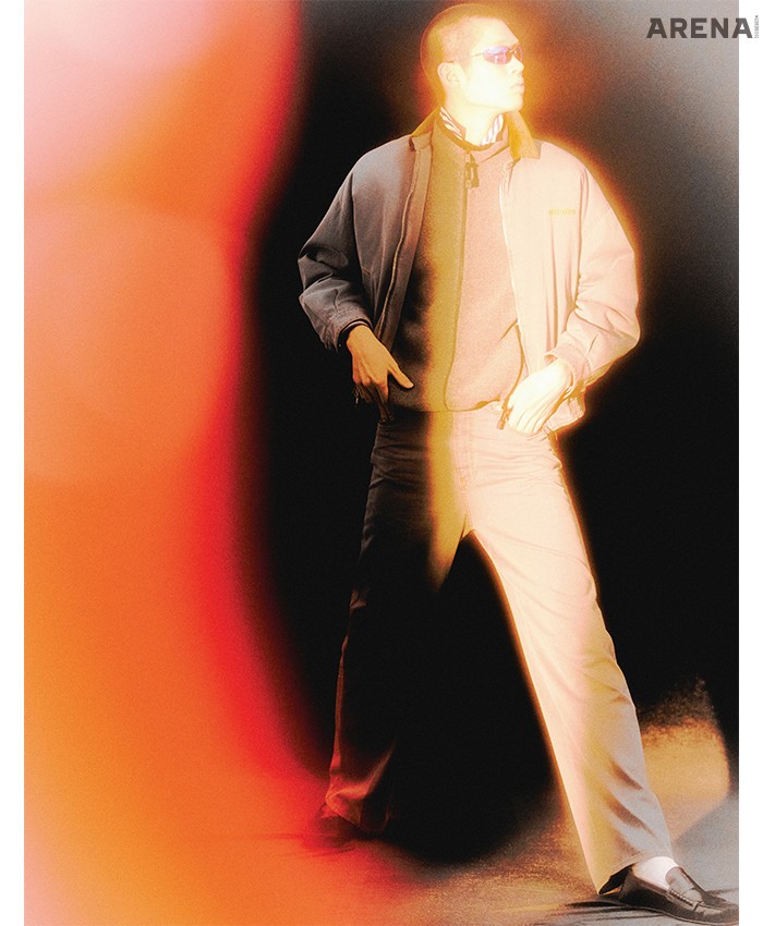 줄무늬 더블브레스트 코트·옥스퍼드 셔츠 모두 가격미정 루이 비통×박서보, 검은색 카고 팬츠 가격미정 루이 비통, 검지와 중지에 착용한 링 모두 가격미정 셀린느 옴므 제품.