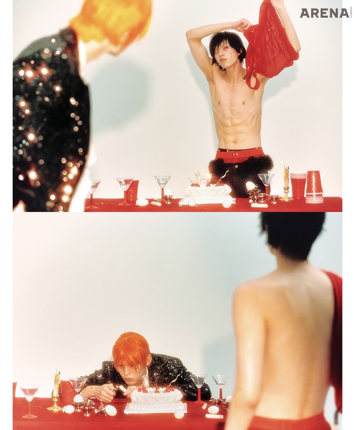 스팽글 장식 재킷·실크 소재 셔츠·러플 장식 타이 모두 가격미정 돌체앤가바나 제품 .메시 소재 톱·브리프 가격미정 디젤, 퍼 벨트를 더한 데님 팬츠 가격미정 웰던 ,메탈 커틀러리와 에그 홀더 모두 루슈어 제품.