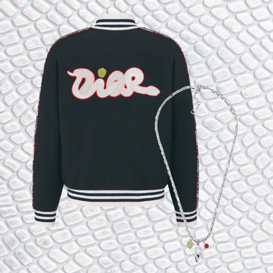 디올은 아티스트 카우스(KAWS)와의 협업을 확장하여, 뱀의 해를 기념하는 'Year of the Snake' 컬렉션을 선보였다. 이번 컬렉션에서는 디올 로고를 뱀 모티프로 창의적으로 재해석했으며, 특히 'i' 위의 점을 사과로 표현한 독창적인 디테일이 돋보인다. 과감한 뱀 로고와 세련된 컬러 조합을 통해 디올만의 독창성과 대담함을 담아낸 것이 특색이다.