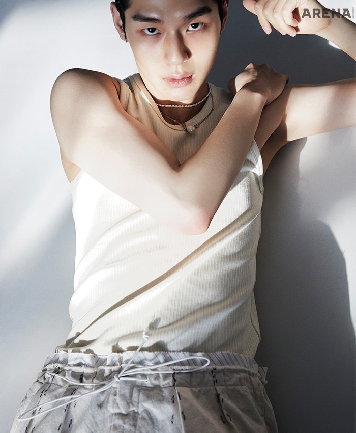 슬리브리스 톱 11만8000원 렉토, 스티치 장식 팬츠 가격미정 메종 마르지엘라, 진주 펜던트 네크리스·진주 네크리스 모두 가격미정 발렌티노 가라바니 제품.