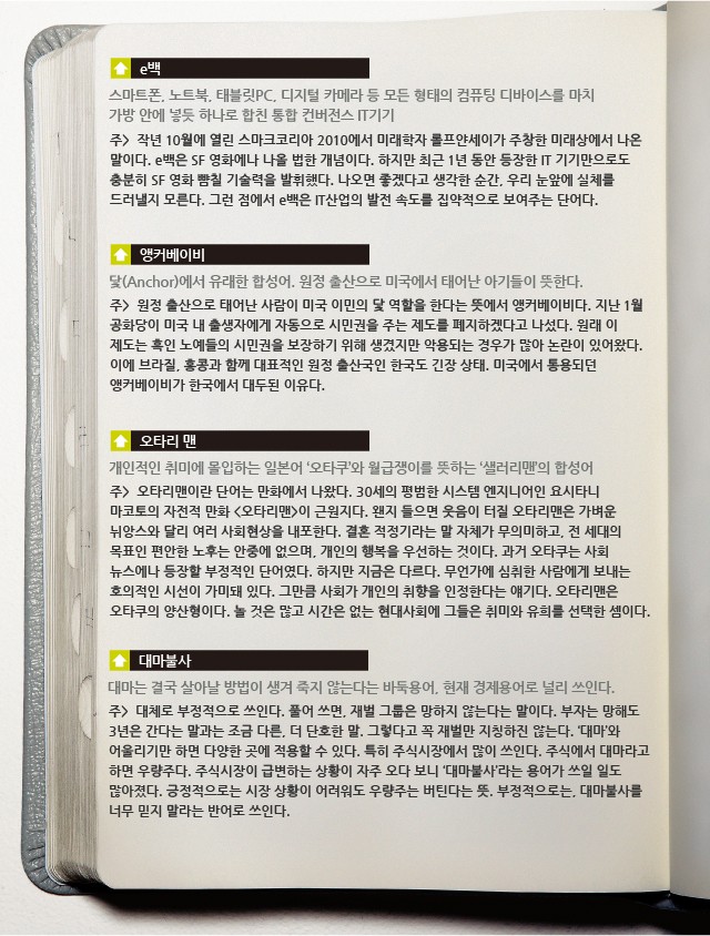 이전 기사보기 다음 기사보기 신개념 사전 글자크기 설정 가 가 기사의 본문 내용은 이 글자크기로 변경됩니다. 스크롤 이동 상태바 미분류기사 신개념 사전 입력 2011.05.30 16:10 댓글 0 글자크기 설정 가 가 기사의 본문 내용은 이 글자크기로 변경됩니다. 1년 3백 65일 날짜가 쌓일때 마다 새로운 말도 차곡차곡 쌓인다. 단어를 보면 현 사회가 보인다. CREDIT INFOEDITOR 김종훈 PHOTOGRAPHY 박종수 이 기사를 공유합니다 저작권자 © 아레나옴므플러스 무단전재 및 재배포, AI학습 및 활용 금지