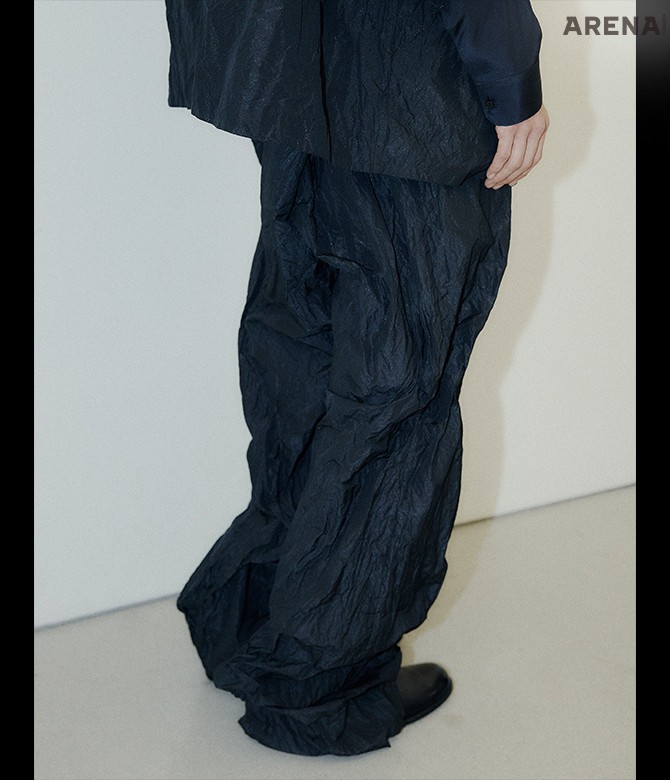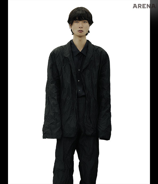 <아레나>에 선공개한 구김 디테일의 수트.