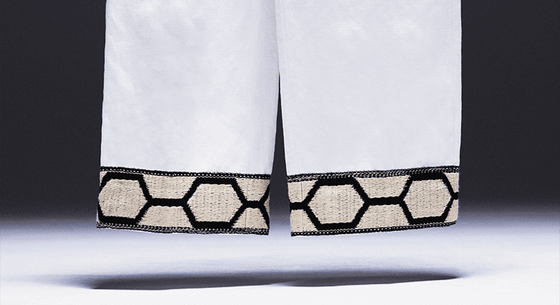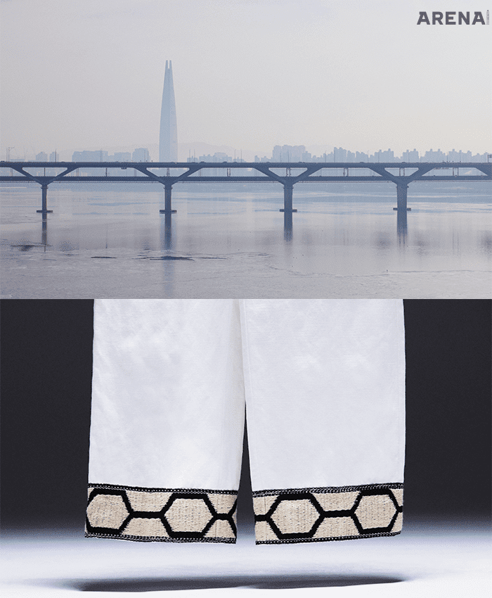 기하학적인 패턴의 밑단이 돋보이는 리넨 팬츠 210만원 발렌티노 제품.