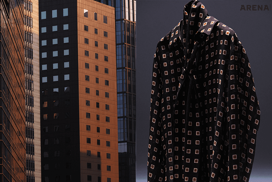 정사각 패턴을 규칙적으로 배열한 얇은 울 소재 셔츠·스카프 모두 가격미정 생 로랑 by 안토니 바카렐로 제품.