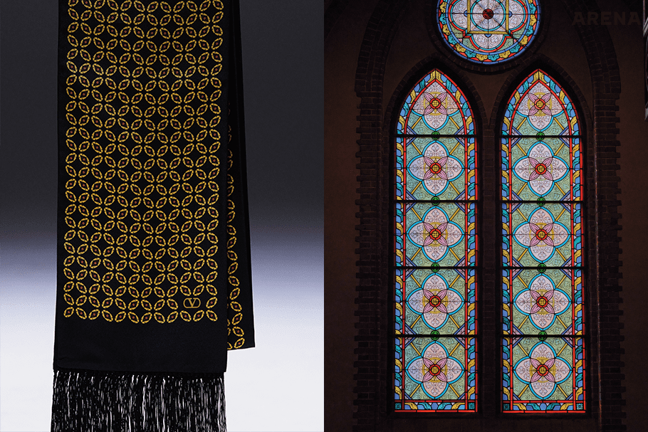 나란히 배열한 꽃 패턴의 프린지 스카프 55만원 발렌티노 가라바니 제품.