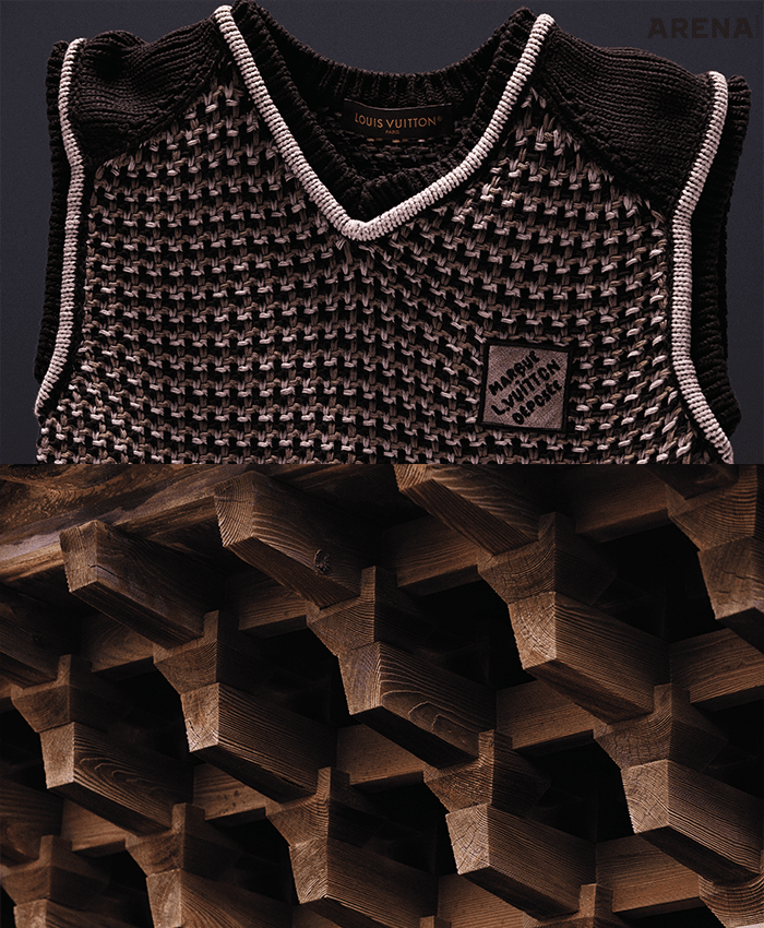 서로 다른 색깔의 실을 엮어 만든 기하학적 패턴의 니트 베스트 가격미정 루이 비통 제품.