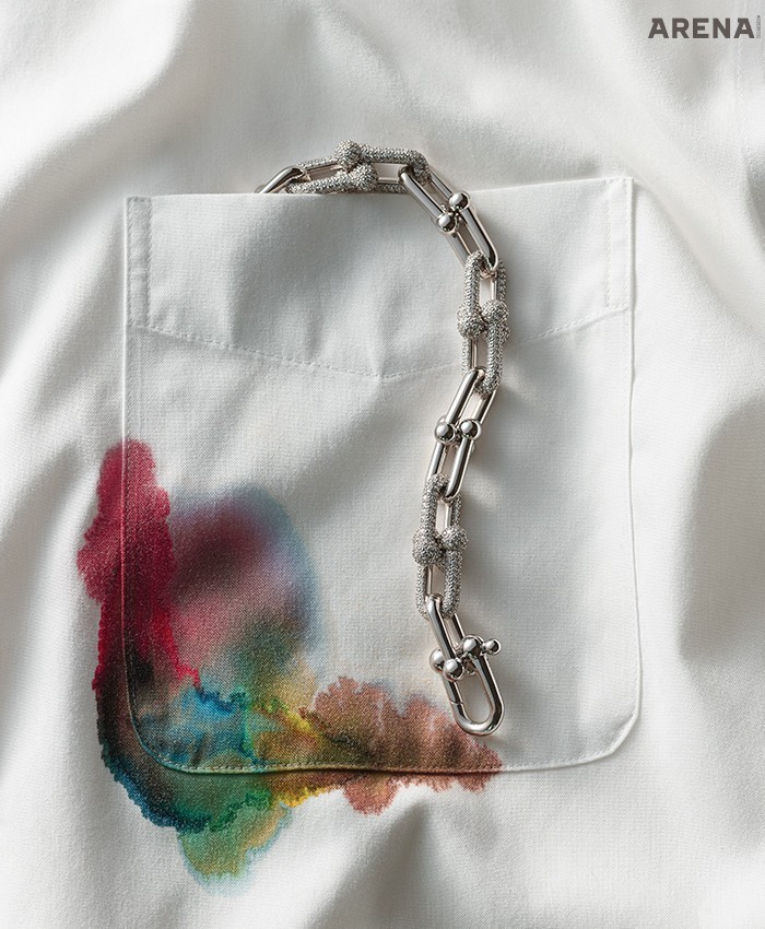 18K 화이트 골드와 다이아몬드 파베 세팅 모티브 체인으로 이어진 티파니 하드웨어 링크 브레이슬릿 가격미정 티파니 제품.