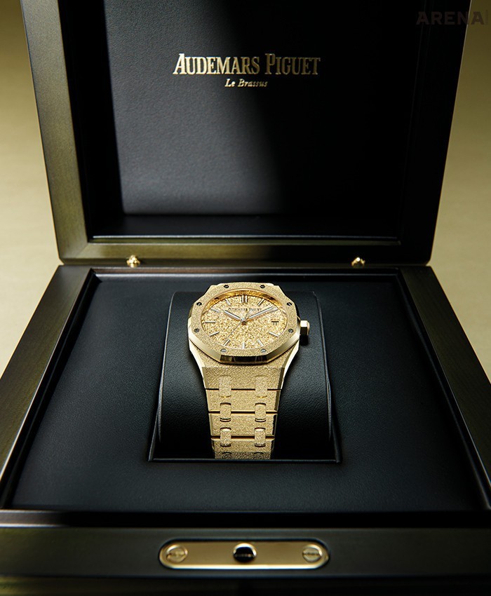 오데마 피게에서 단 하나의 시계를 구입해야 한다면 단연 로열 오크다. 금값이 점점 오르니 이왕이면 골드 워치로로. 열 오크의 골드는 어딘가 남다른 구석이 있는데 이건 표면을 해머로 하나하나 두들겨 완성한 프로스티드 골드 덕분이다. 게다가반 짝이는 다이얼은 전기주조법 중 하나인 금속 증착 공정을 거쳐 원자 단위로 압인 가공이 가능한 금형을 통해 완성했다. 한마디로 상당한 기술력과 공을 들여 탄생했다는 이야기.