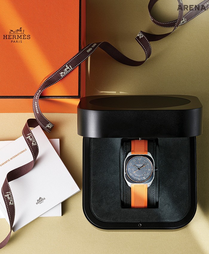 통상적인 관념을 벗어난 시계. 모서리를 둥글게 다듬은 쿠션형 케이스, 베젤과 케이스에 적용한 탄소 기반 합성 신소재인 그래핀과 티타늄, 브랜드가 디자인한 고유의 인덱스까지. 새로운 시도가 모여 브랜드의 차세대 워치 H08을 완성했다. 이 모든 요소가 조화로워 보이는 건 에르메스이기에 가능한 일. 파랑, 초록, 노랑 등 다양한 컬러가 있지만 모름지기 에르메스는 오렌지 컬러가 마땅하다.