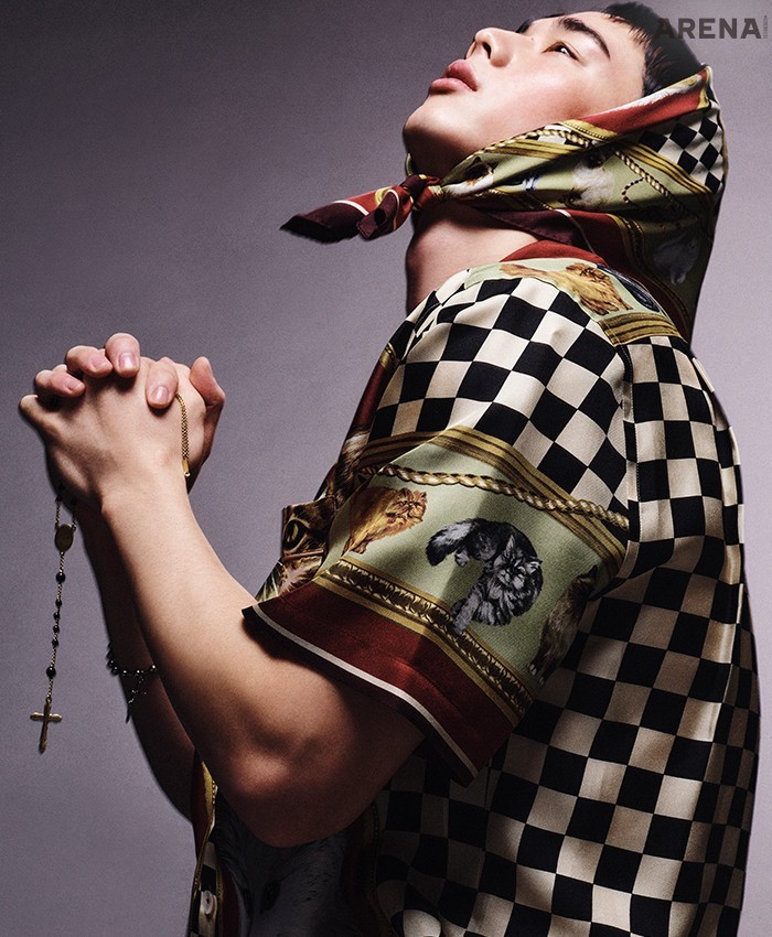 고양이 프린트 셔츠 가격미정·고양이 프린트 스카프 70만원·크로스 펜던트 브레이슬릿 122만원·손에 쥔 크로스 펜던트 네크리스 175만원 모두 돌체앤가바나 제품.