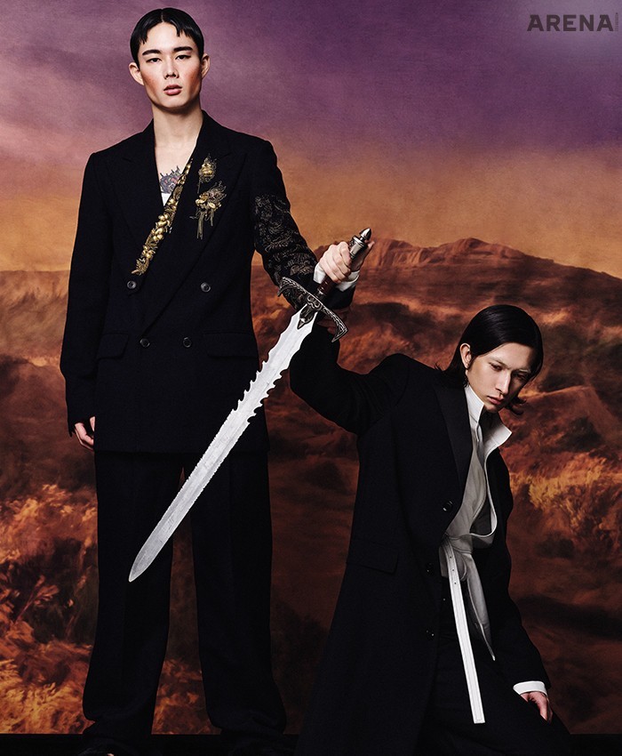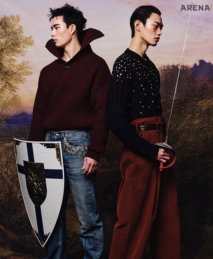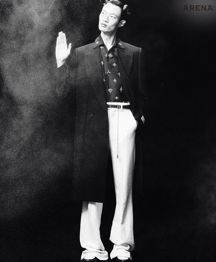 핀 스트라이프 더블브레스트 재킷 400만원대·스톤 장식 셔츠 400만원대·코듀로이 팬츠 200만원대·로퍼 100만원대·체인 장식 벨트 100만원대 모두 아미리 제품.