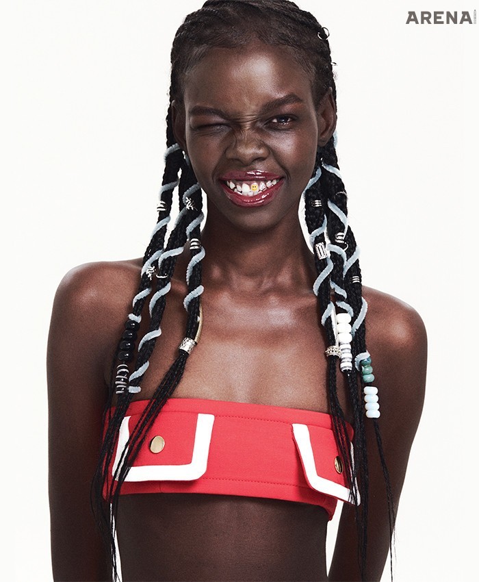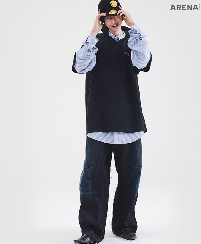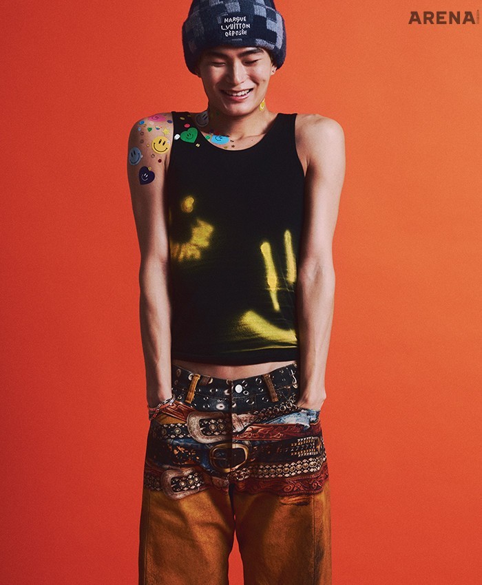벨트 프린트 데님 팬츠 가격미정 아크네 스튜디오, 다모플라주 패턴 비니·체인 브레이슬릿·실버 브레이슬릿 모두 가격미정 루이 비통, 슬리브리스 톱 에디터 소장품.