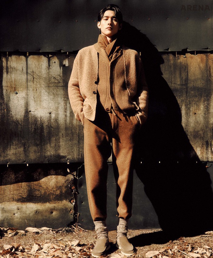 니트 카디건·이너로 입은 숄칼라 카디건·조거 팬츠·양말·머플러·브로치·스웨이드 소재 화이트 솔 로퍼 모두 가격미정 로로피아나 제품.