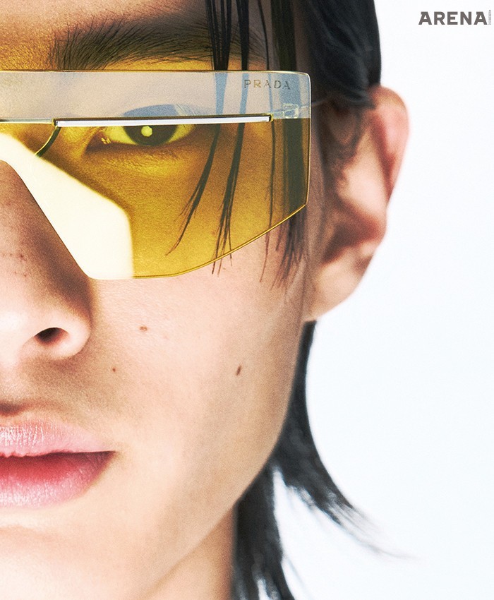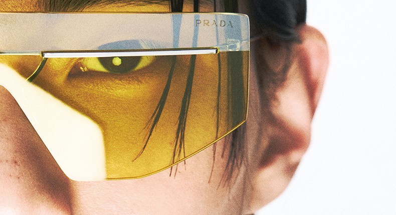 노란색 틴티드 렌즈가 돋보이는 실드 선글라스 가격미정 프라다 제품.