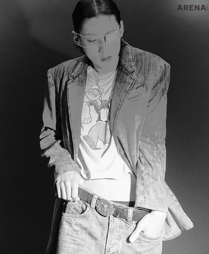 워싱 디테일 데님 재킷·데님 팬츠 모두 가격미정 디젤, 뽀빠이 프린트 크롭트 티셔츠 가격미정 코치, 태그 펜던트 네크리스 8만6000원 604서비스, 벨트 에디터 소장품.