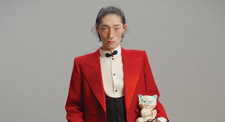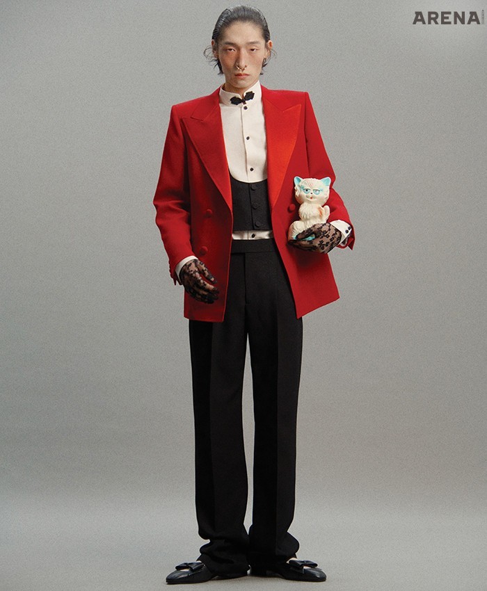 새빨간 더블브레스트 재킷·새틴 블라우스·베스트·팬츠 모두 가격미정 발렌티노, 고양이 모양 클러치백·레이스 장갑·노즈커프·양말·리본 장식 슈즈 모두 가격미정 발렌티노 가라바니 제품.