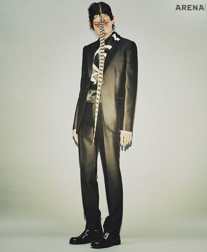 은은한 광택이 돋보이는 재킷 380만원·로고 프린트 블라우스 290만원·팬츠 190만원 모두 로에베, 레이스업 슈즈 가격미정 루이 비통 제품.