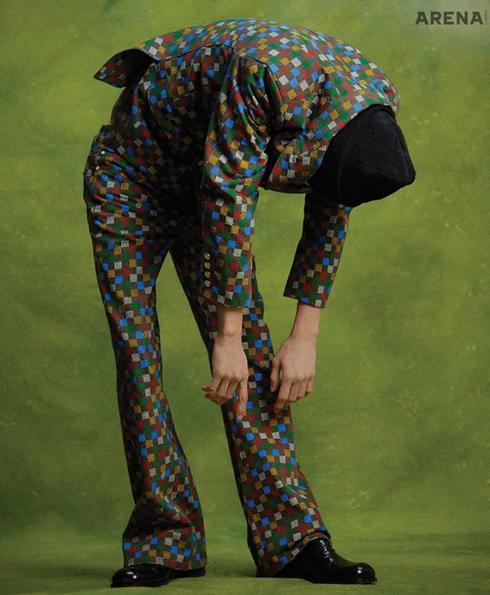 알록달록한 격자무늬 재킷·플레어 핏 데님 팬츠·비니·레이스업 슈즈 모두 가격미정 루이 비통 제품.