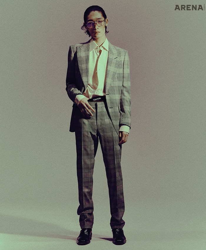 글렌 체크 재킷·실키한 셔츠·팬츠·보라색 브리프·에비에이터 안경·첼시 부츠 모두 가격미정 톰 포드 제품.