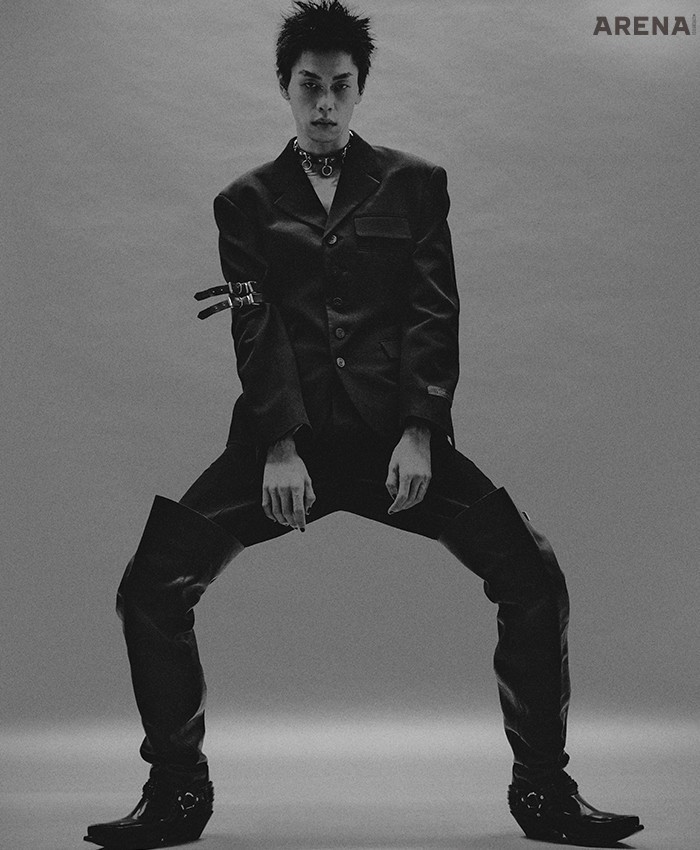 싱글브레스트 재킷 374만원·팬츠 141만원·웨스턴 니하이 부츠 304만원 모두 베르사체, 초커·브레이슬릿 모두 에디터 소장품.