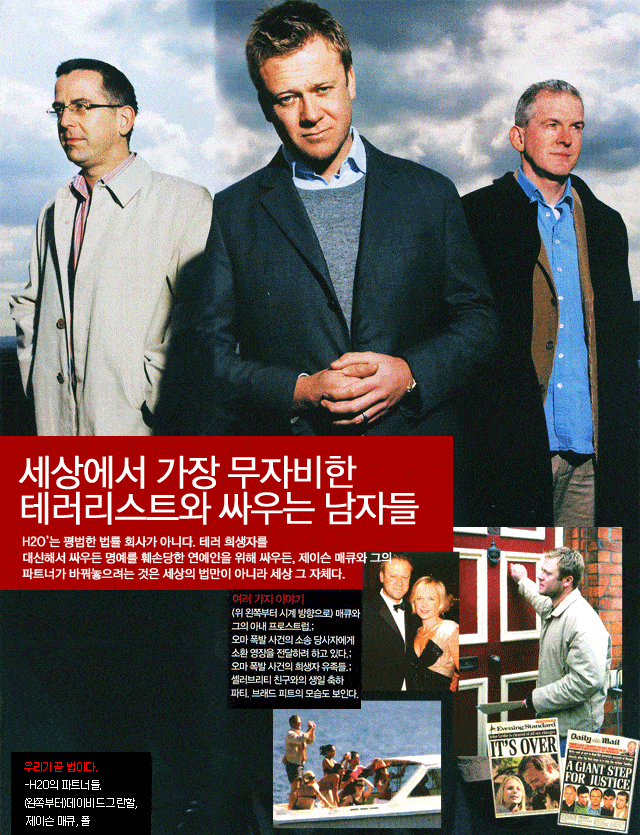 그런데 막상 만나보면 완전히 다릅니다. 물론 어떤 사람들은 좀 특이하기도 하죠. 그러면 사람은 이렇게 생각해요.‘야, 이 오만 방자한 인간아, 너 혼자 잘 먹고 잘살아라!’ 그렇지만 스타라는 사람들 중 대부분은 좋은 사람들입니다.4 대체 이런 생활을 어떻게 참고 견디나 하고 의아해 할 정도로 말이죠.” 매큐는 자신을 아주 평범한 인간이라고 진단한다. H2O 사무실에서도 그는 아주 편안한 인상이다. 책상은 갖가지 서류로 어지럽혀져 있으며 아이팟에서는 음악이 흘러나온다. 그는 곧잘 가죽 소파에 앉아 <아레나>를 읽는다. 정장을 입는 날은 거의 없다. 말끔하게 면도를 한 얼굴로 나타나는 날도 거의 없다. 그래서 더더욱 가족과 평온한 생활을 하고 싶어 하는 그는 최근 은퇴한 후에 살기 위해 스코틀랜드에 작은 농장을 하나 샀다. 악마 (테러리스트)를 쫓아내는 십자군의 스테레오 타입과는 어울리지 않지만 말이다. 매큐 같은 이력이 있는 사람에겐 아마 다른 건 몰라도 직업상 지구상에서 내로라하는 악당을 대적하는 인물상이 어울릴 것 같기도 하다. 어떻게 보면 약간 그런 면도 있다. 매큐는 아일랜드공화국군 (IRA)의 정보원인 이먼 컬린스가 1999년에 잔인하게 살해되기 전, 그와 함께 일한 적이 있었다. 어떤 위협이나 협박에 시달리는 사람은 대개의 경우 50보 밖에서 봐도 뭔가 불안해 하고 있음이 느껴진다. 그러나 이 남자는 그렇지 않다. “그럴 경우, 사람들은 대개 아주 위험한 인물과 상대해야 한다는 사실을 잘 인식합니다. 그래서 겁을 먹죠. 그러나 조심하는 것과는 별도로 신중하게 생각해봐야 합니다. 나 같은 경우, ‘잠깐, 나는 변호산데?’ 하는 생각이 드는 거죠. 나를 위협하는 상대가 누구든, 나를 다치게 하거나 내 파트너 중 누군가를 위험하게 하는 걸로 다른 사람의 행동을 막을 수 있을 거라고 계산할까요? 절대 그렇지 않죠. 그런 일이 벌어진다 해도 사람들의 행동은 달라지지 않을 겁니다. 오히려 우리가 벌이고 있는 캠페인을 더 홍보해주는 격이죠. 테러리스트가 그런 짓을 왜 하겠습니까? 정말 바보가 아니라면 그런 짓은 못하죠.” |