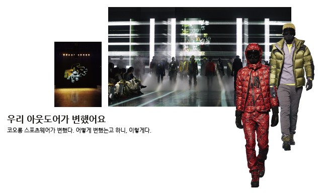 지난 시즌부터 코오롱 스포츠는 프랑스 출신 디자이너 장 콜로나와 협업을 통해 아웃도어에 패션 개념을 접목하는 새로운 시도를 하였다. 그 노력의 연장선으로 이번 F/W는 익스트림, 트레킹, 트래블 이 세 개의 독립된 라인이 조화를 이루며 놀라운 아웃도어 스타일로 변모했다. 산악인 하면 생각나는 아웃도어 룩이 아니다. 몸에 피트되는 실루엣과 다채로운 색감을 이용해 기능성과 심미성까지 두루 갖춘 컬렉션을 만든 거다. 그러니 아웃도어는 패셔너블하지 않아서 일상복으로 입을 수 없었다라는 말은 더 이상 통하지 않는다. 다 코오롱 스포츠웨어 덕분이다.
