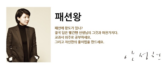 두어 달 전 술자리에서 패션 업계의 루키인 한 남자가 말했다. 탐스를 신고 엔지니어드 가먼츠로 보이는 재킷을 걸친, 얼굴의 아우트라인을 거뭇하게 감싼 수염까지 액세서리로 느껴지는 그가 빗소리 따라 소주를 마시다가 불현듯 그랬다. “<패션왕> 보셨어요? 죽여요. 고등학교가 배경인데, 패션 스타일로 한 칼 휘두르는 내용이라고요. 무협지처럼요. 이건 무림 고수를 향한 한 판 승부! 뭐 그런 거라니까요. 발상이 완전 쓰러져요.” 클래식 무드의 30대 남자가 열에 달뜬 소년처럼, 그 빗속에 클럽으로 달려갈 것만 같은 얼굴로 그랬다.