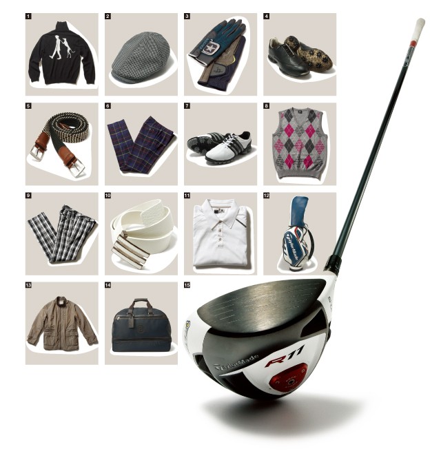 1 캐시미어 니트 80만원대 아다바트 제품. 2 헌팅캡 7만5천원 헤지스 골프 제품. 3 장갑 가격미정 보그너 골프, 장갑 가격미정 헤지스 골프 제품. 4 기능이 남다른 골프화 49만원 아디다스 포르쉐 디자인 제품. 5 두 가지 색상의 위빙 벨트 가격미정 닥스 골프 제품. 6 연보라색 체크 팬츠 가격미정 보그너 골프 제품. 7 골프화 29만8천원 아디다스 골프 제품. 8 아가일 체크 베스트 가격미정 보그너 제품. 9 체크 팬츠 20만원대 헤지스 골프 제품. 10 흰색 벨트 9만8천원 아디다스 골프 제품. 11 흰색 골프 셔츠 17만원 아디다스 포르쉐 디자인 제품. 12 캐디 백 39만원 테일러메이드 제품. 13 내구성이 뛰어난 윈드브레이커 49만5천원 아다바트 제품. 14 남색 보스턴백 가격미정 보그너 골프 제품. 15 드라이버 71만원 테일러메이드 제품.