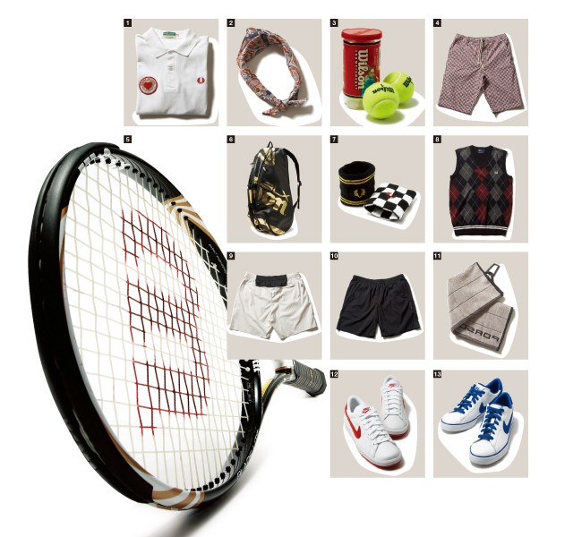 1 흰색 피케 셔츠 16만8천원 프레드 페리 by 플랫폼 제품. 2 페이즐리 문양의 스카프 3만8천원 프레드 페리 by 플랫폼 제품. 3 테니스 공 3천원 윌슨 제품. 4 체크 팬츠 21만8천원 프레드 페리 by 플랫폼 제품. 5 테니스 라켓 20만원대 윌슨 제품. 6 테니스 라켓 가방 9만원대 윌슨 제품. 7 손목 보호대 2만5천원 프레드 페리 by 플랫폼 제품. 8 아가일 베스트 18만5천원 프레드 페리 by 플랫폼 제품. 9, 10 흰색과 검은색 테니스 쇼츠 각각 17만원 모두 아디다스 포르쉐 디자인 제품. 11 고리가 달려 있어 편리한 타월 가격미정 포르쉐 디자인 제품. 12, 13 미끄럼 방지 기능이 있는 빨간색과 파란색 운동화 모두 가격미정 나이키 제품.