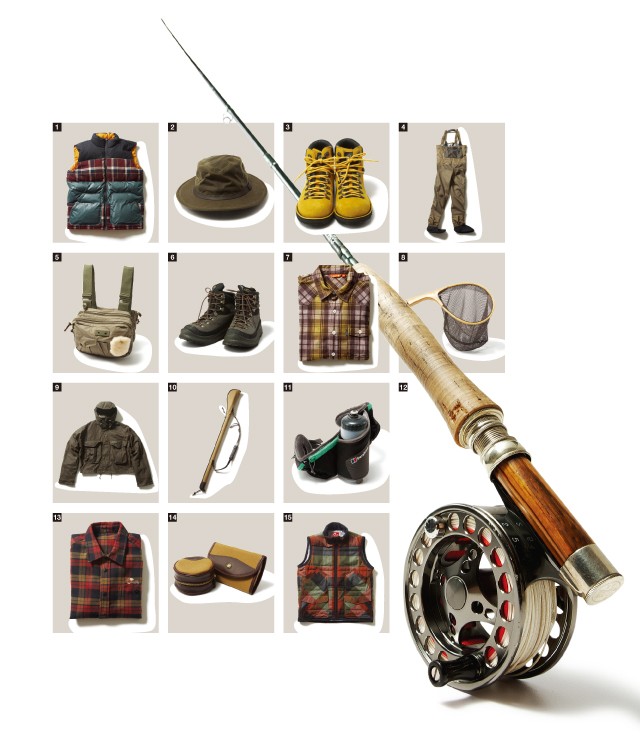 1 두툼한 패딩 베스트 가격미정 라푸마 제품. 2 왁스 코팅한 야외용 모자 9만5천원 필슨 제품. 3 어떤 아웃도어 상황에서도 적응력이 뛰어난 부츠 69만원대 스톤 아일랜드 제품. 4 낚시용 레이어 웨이더 59만2천원 필슨 제품. 5 조끼 대용 대용량 태클 백 25만7천원 필슨 제품. 6 플라이 낚시용 방수 부츠 가격미정 심스 제품. 7 갈색 체크 셔츠 17만원 라푸마 제품. 8 열목어란 뜻을 지닌 브랜드의 뜰채 가격미정 레녹 제품. 9 웨이딩 재킷 45만8천원 필슨 제품. 10 낚싯대 가방 37만8천원 필슨 제품. 11 휴대용 스포츠 물병 가격미정 버그하우스 제품. 12 플라이 낚시를 위한 낚싯대 가격미정 R.L. 윈스턴 로드코, 릴 가격미정 가이드 라인 제품. 13 모직 소재 체크 셔츠 가격미정 네파 제품. 14 플라이 낚시 전용 플라이 케이스 13만6천원 필슨 제품. 15 패딩 베스트 가격미정 네파 제품.