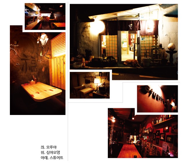 일본 영화의 한 장면을 상상하면 쉽겠다. 여자친구를 집에 바래다주다 헤어지기 아쉬워 무작정 들어가는 작은 사케 집. 우리나라에도 이런 곳이 있다는 걸 이곳에 가보고야 알았다. 왁자지껄한 이자카야가 여기저기 생기는 건 알았지만 ‘사케 바’가 있는 줄은 전혀 기대하지 못했던 터다. 신천, 그러나 한적한 주택가에 둥지를 튼 모루야에 앉아 있으면 나무 도마 위에서 파를 써는 소리가 그렇게 좋게 들릴 수가 없다. 거기에 어울리는 조용하면서도 몽환적인 ‘시부야계 음악’은 감미롭다 못해 드라마틱하기까지 하다. 술은 술술 넘어가고 술병은 술술 늘어난다. 안주는 일본에서 직접 연마해온 ‘불 맛’ 제대로 박힌 숯불 꼬치구이가 주 무기다. 특히 단돈 5백원에 마시멜로 꼬치구이를 판매하는데, 달디단 마시멜로와 사케가 선보이는 의외의 궁합이 이채롭다. 머릿속에 정형화된 이자카야의 이미지를 탈피, 모던하면서도 아기자기한 인테리어는, 그래서 이곳을 반드시 여자친구와 함께 찾아야 하는 이유가 된다.