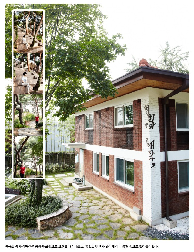 멀리서 빨간색 니트 셔츠를 입은 외국인 여자가 걸어왔다. 물어보니 오늘 입주한 독일의 번역가라고 했다. 이름은 하이케 리. 이야기를 나누고 싶은데 겁이 났다. 독일 사람이랑 대화를? 가까이 오자 안현미가 말을 걸었다. 둘은 대화가 됐다. 한국어로. 아, 한국 문학 작품을 독일어로 번역하는 작가가 한국어를 못할 리 없잖아. 한국어로 대화를 나눴다. 그녀는 이곳의 분위기가 마음에 든다고 했다. 조용하고 아늑하다고 했다. 그러고 보니 떠드는 건 새들과 우리 셋뿐이었다. 그녀는 연희에 있는 동안 이호철, 김원우의 소설을 번역할 계획이라고 했다. 이렇게 좋은 친구를 기록하는 건 의무라는 생각이 들어서 사진을 찍자고 했다. 그녀는 낮은 둔덕을 세 번이나 올라갔다 내려갔다. 헤어질 때는 한국어로 “감사합니다”라고 인사했다.