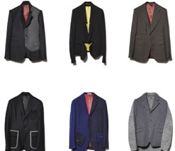 재킷의 중심을 기준으로 한쪽은 파란색, 다른 한쪽은 감색이다. 마치 2개의 재킷을 잘라 붙인 것같이 말이다. 게다가 포켓이 있어야 할 자리에는 또 다른 소매를 붙여놓았다. 가격미정.